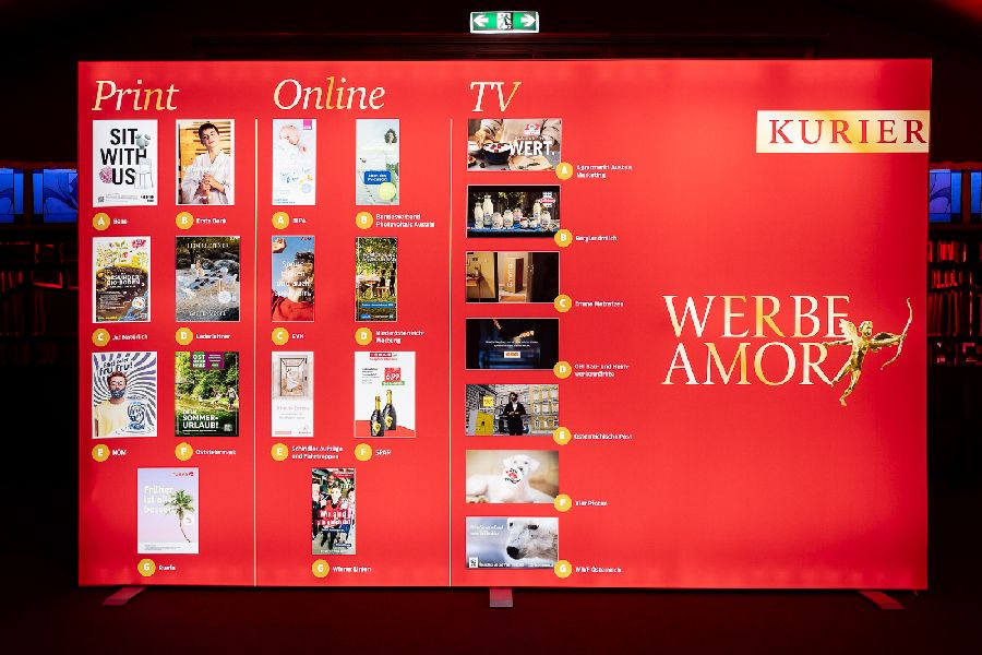 Zum 32. Mal zeichnete das KURIER Medienhaus seine Top-Werbekunden, Agenturen, Auftraggeber und Kreativen mit dem KURIER „Werbe-Amor" in Gold, Silber und Bronze aus. Vergeben wurden die Preise erstmals in drei Kategorien: Print, Digital und TV. Die Prämierung erfolgte im Rahmen einer Gala im Palazzo Spiegelpalast von